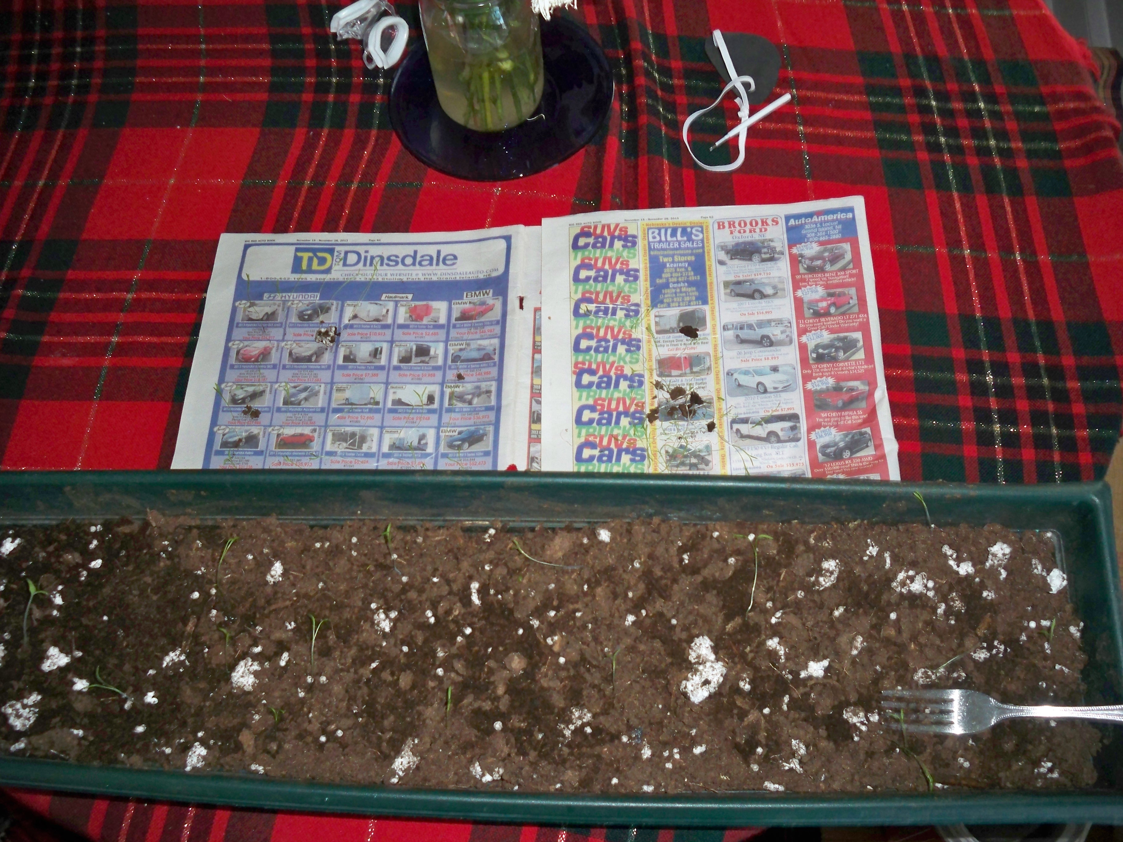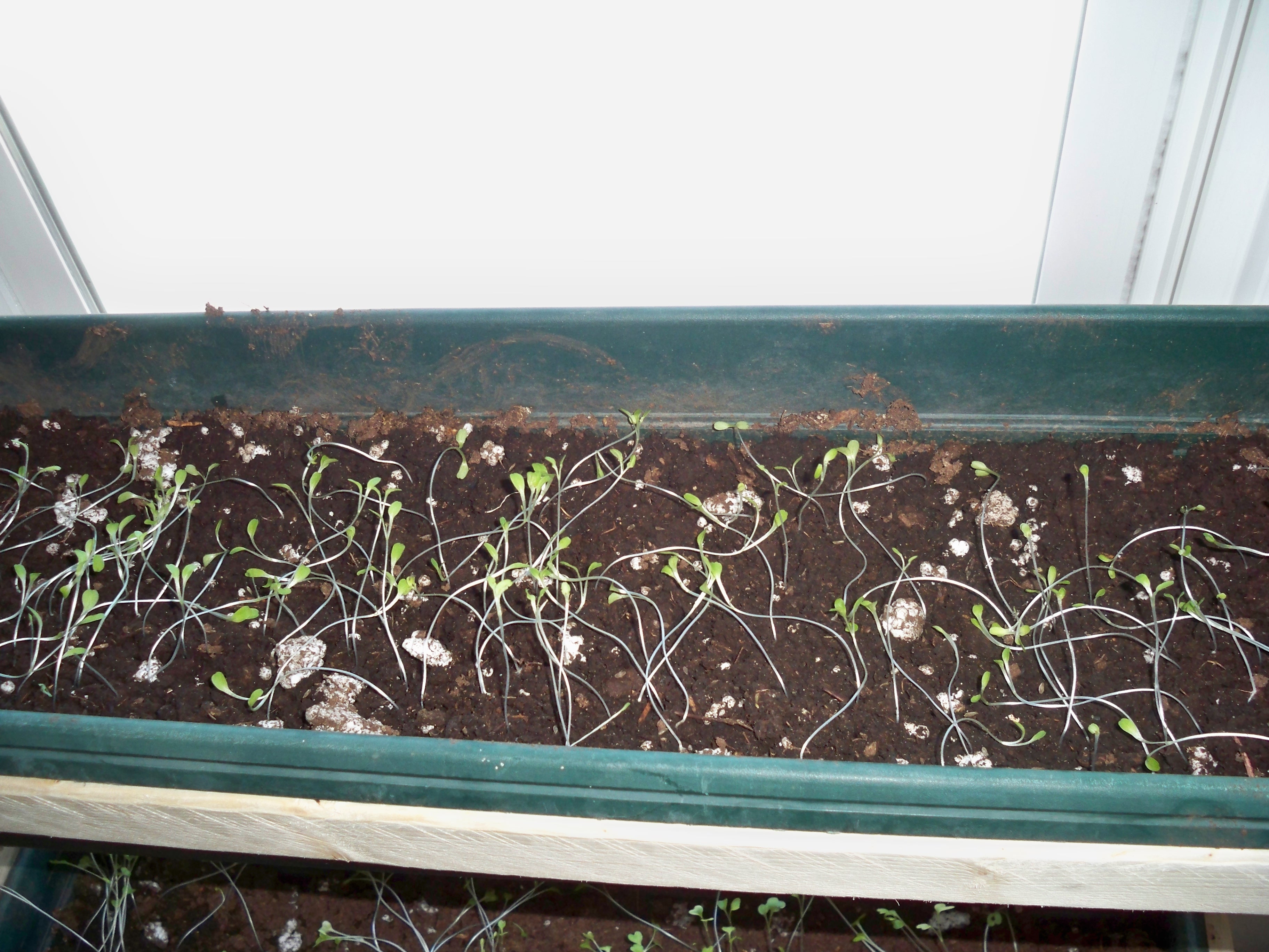 The babies needed to be thinned so I salvaged the strong ones for the AP system and composted the ones that weren’t doing so good. Then left the strong ones in a staggered position in the planters and top-dressed with about 1/4 inch of vermi-compost.
