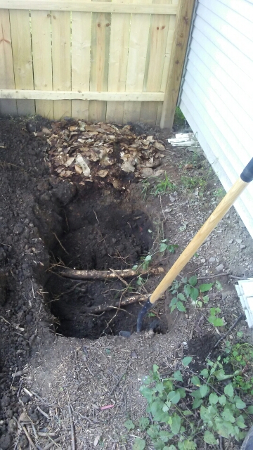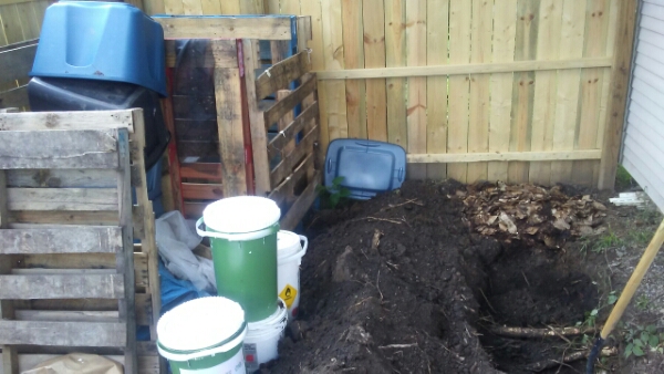 After having the yard flagged for underground utilities, I dug a trench in order to vermicompost. The idea is that I will be hot composting (used coffee grounds and cardboard) in the pallet bins to the left which will then be fed to the worms in the trench to the right. The end result will be super compost!