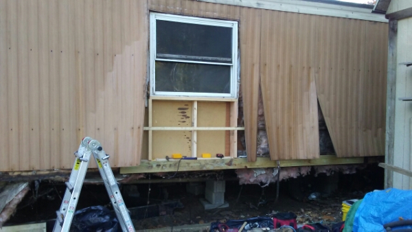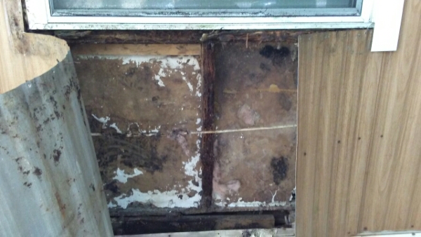 There was quite an extensive amount of damage done from rain water leaking in to the wall on this one. The exterior frame, studs, subfloor, drywall, and insulation were rotted out and mold was taking hold.