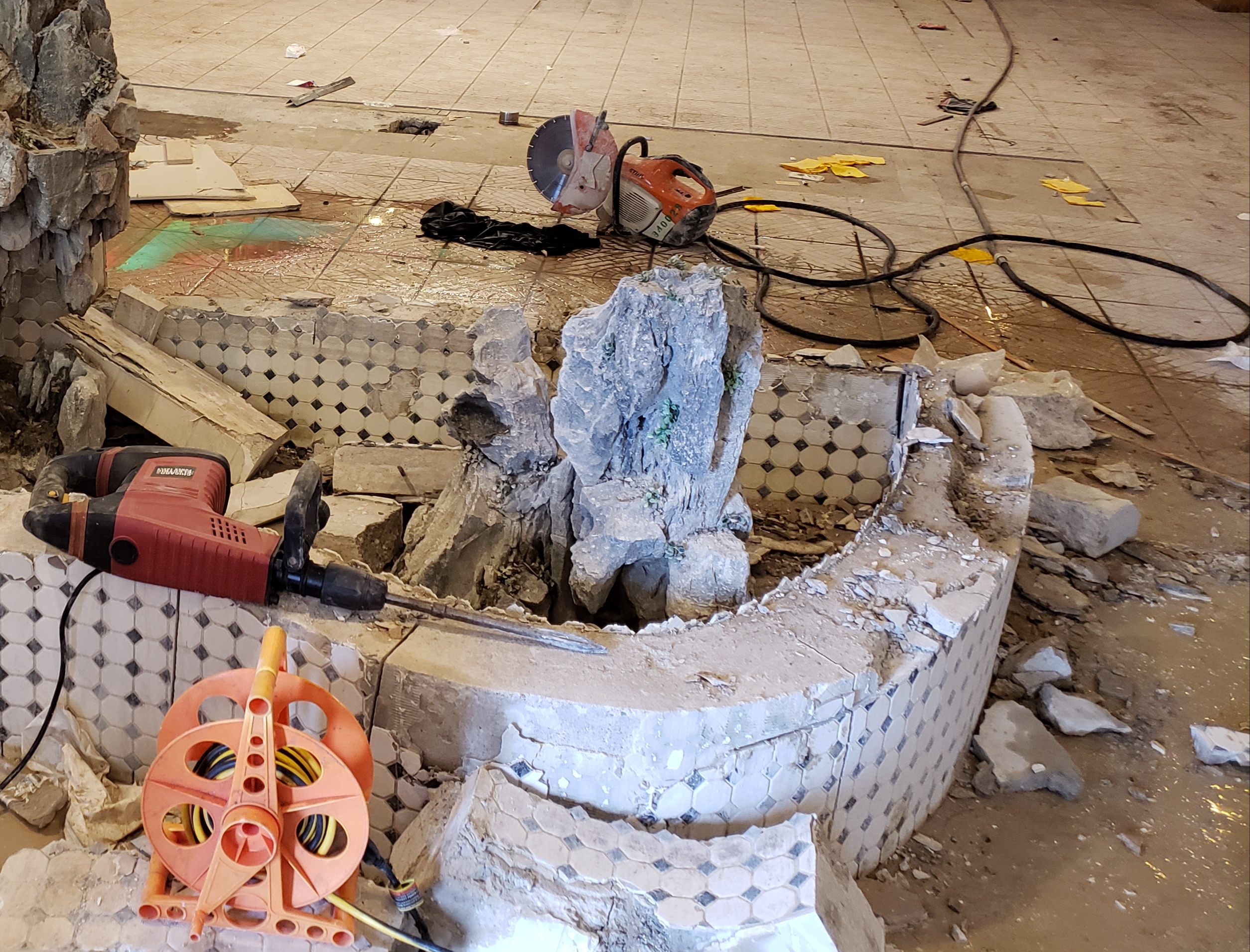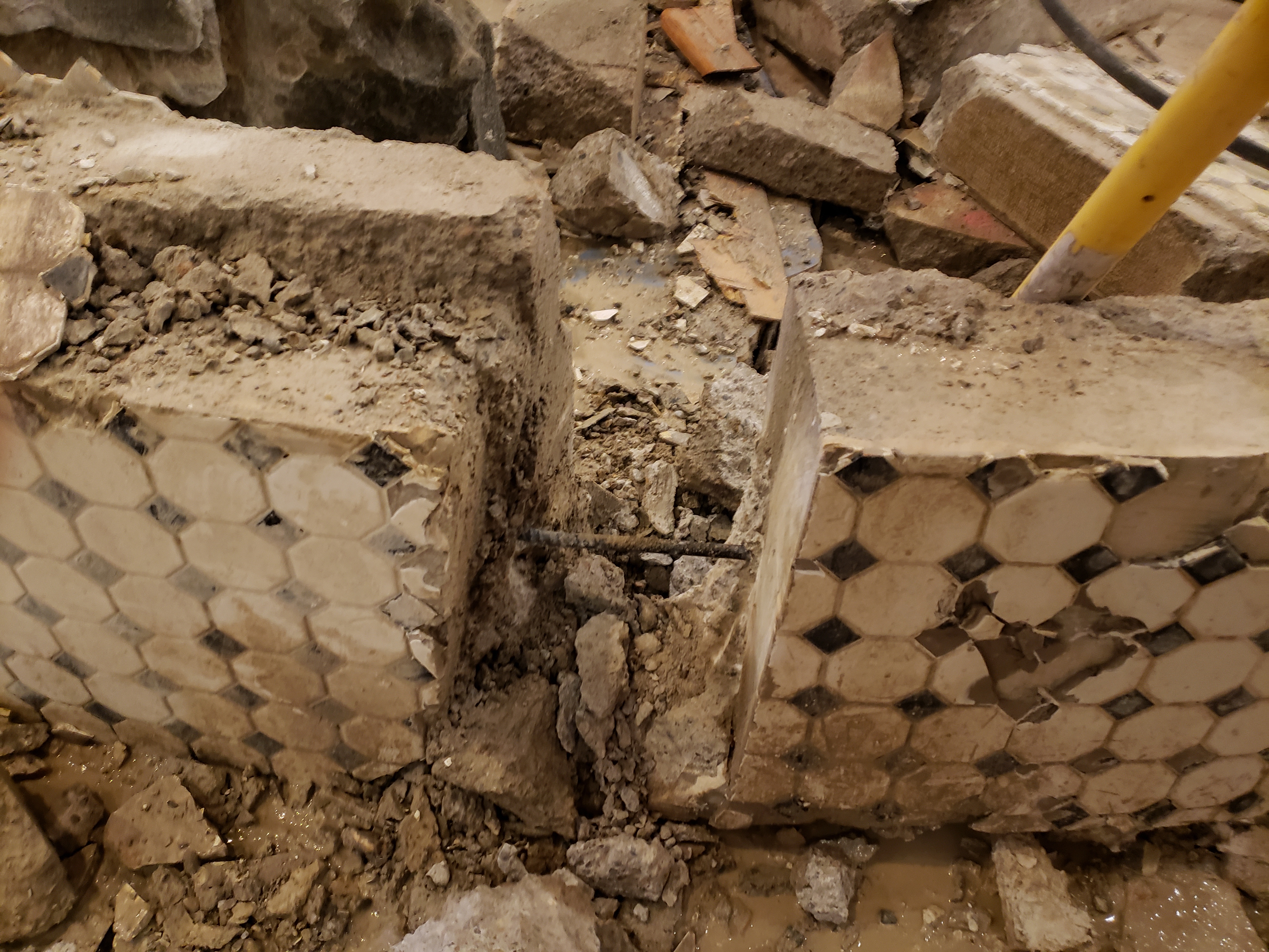 This sucker was pretty killer. 8 inches thick and rebar horizontally and vertically. Finally ended up cutting it in chunks with a 12in cement saw then hammering a wedge to break pieces off of rebar. At least the floor came up relatively easy with a sds hammer (love that thing!).