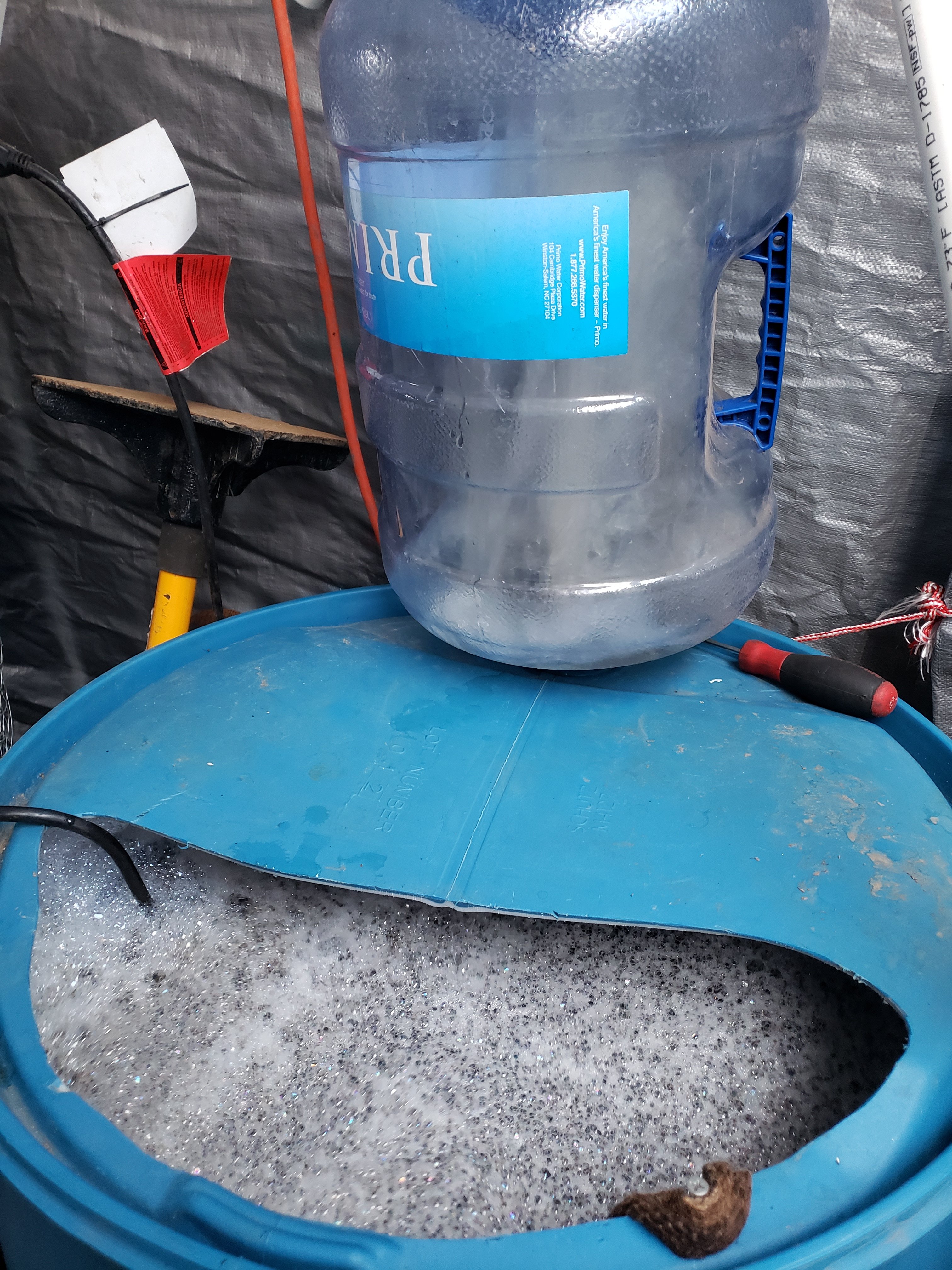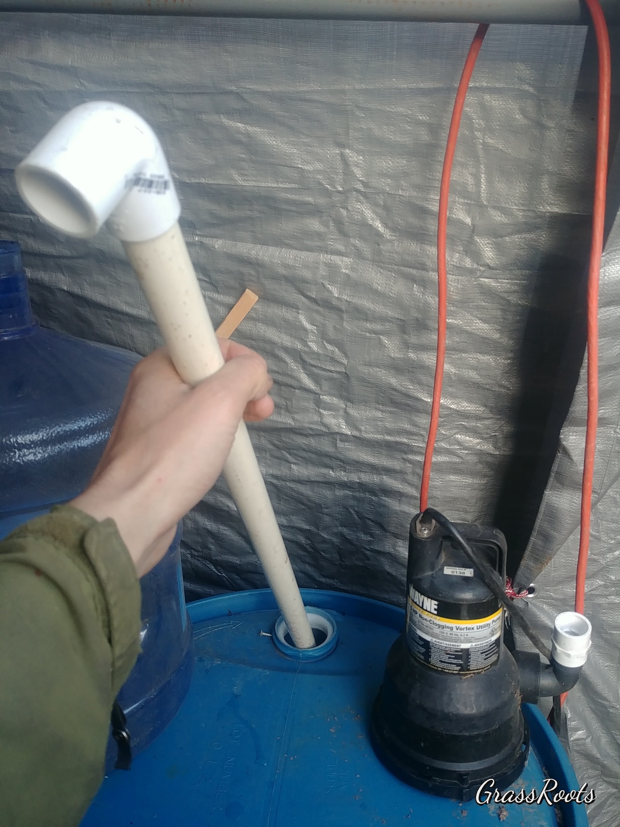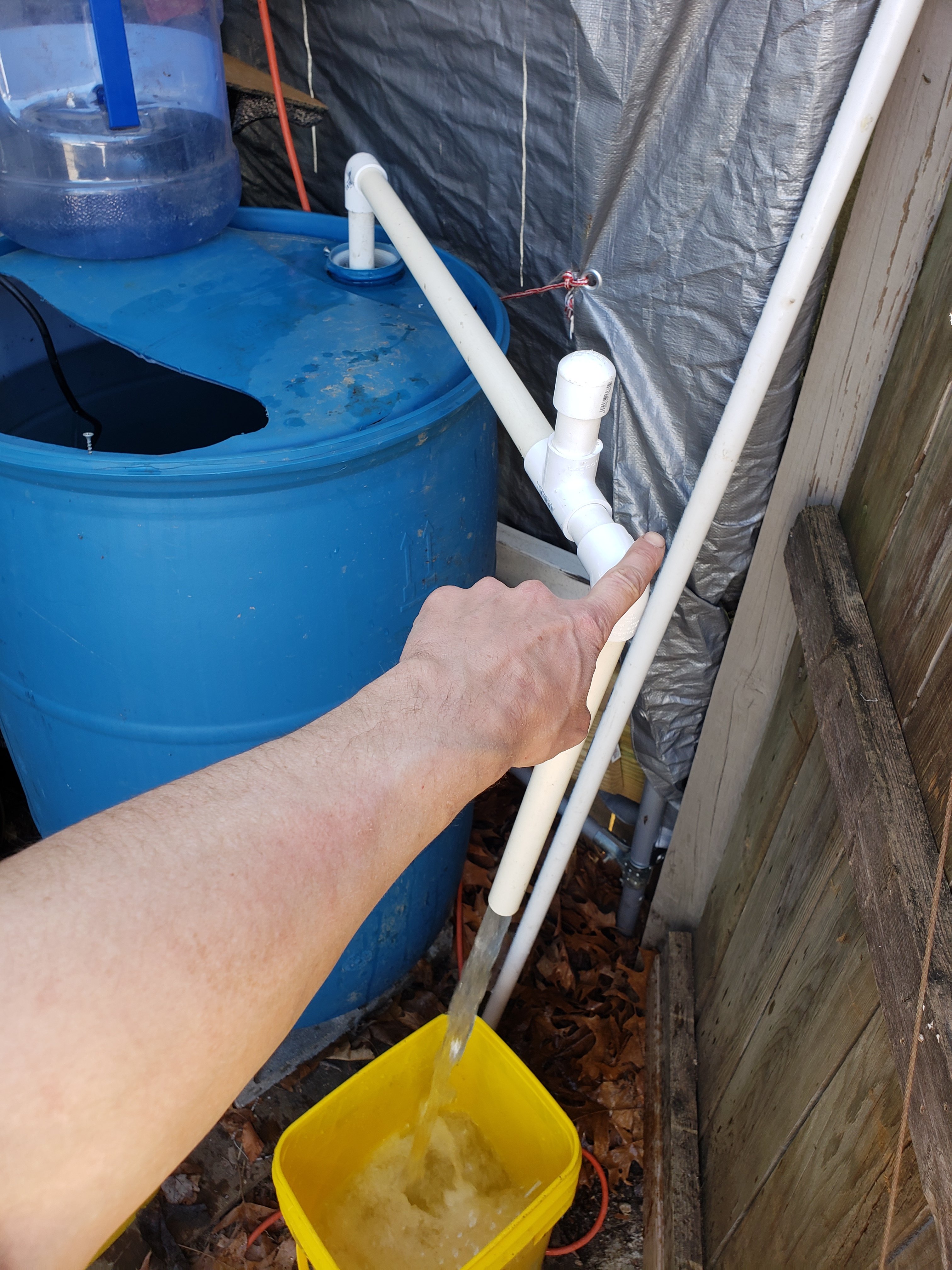 In order to get the VCT out I put some pvc pipe together to direct the flow to a bucket. A hole and stopper had to be added in order to break the siphon. Otherwise it will keep filling after the pump is shut off. I guess that could be used to advantage… I will check that out.
